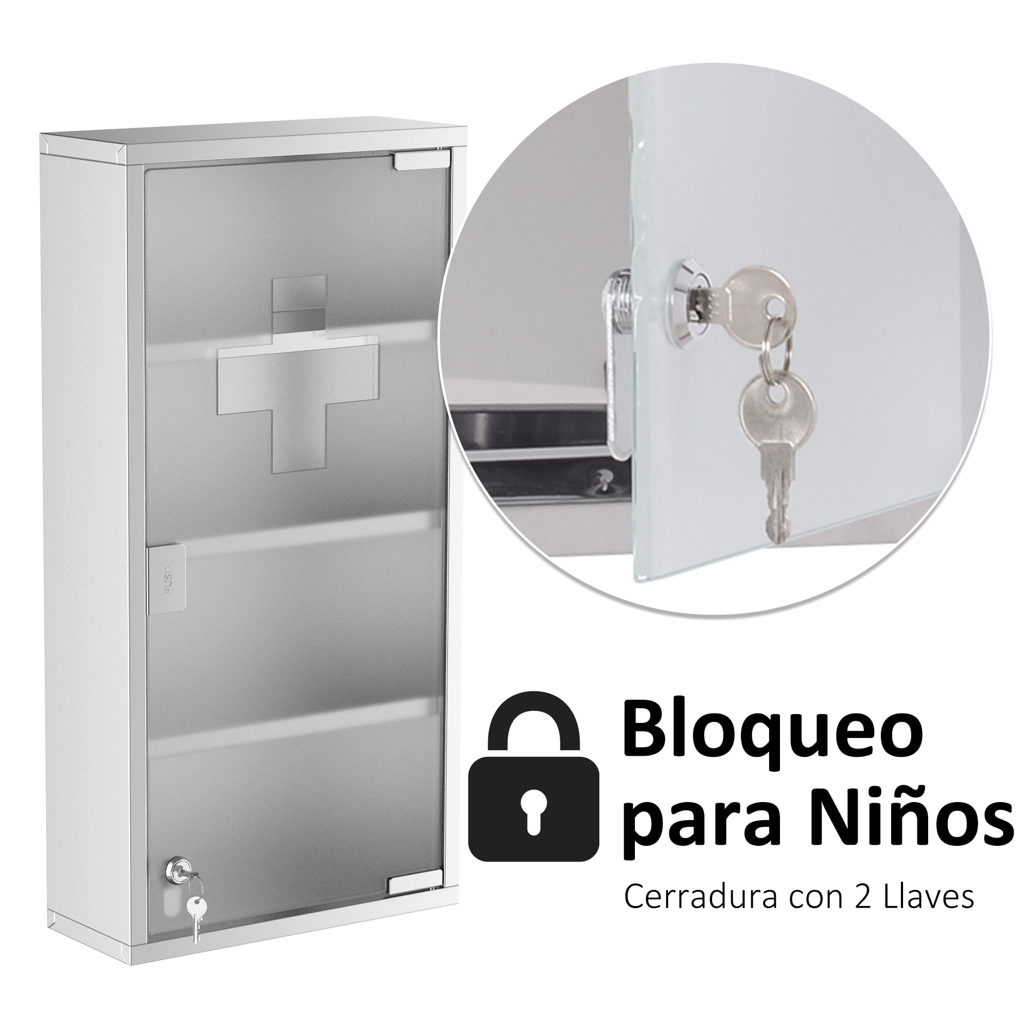 Armario botiquín de acero inoxidable con 4 niveles de almacenaje y cerradura de seguridad con 2 copias de llaves. Nuestros armarios botiquín es son ideales para guardar medicinas y medicamentos de primeros auxilios. Este armario botiquín de pared es ideal para el cuarto de baño y tiene cerradura para evitar que los bebes lo abran. La estructura es de metal y la puerta de vidrio esmaltado con una cruz en el frontal.