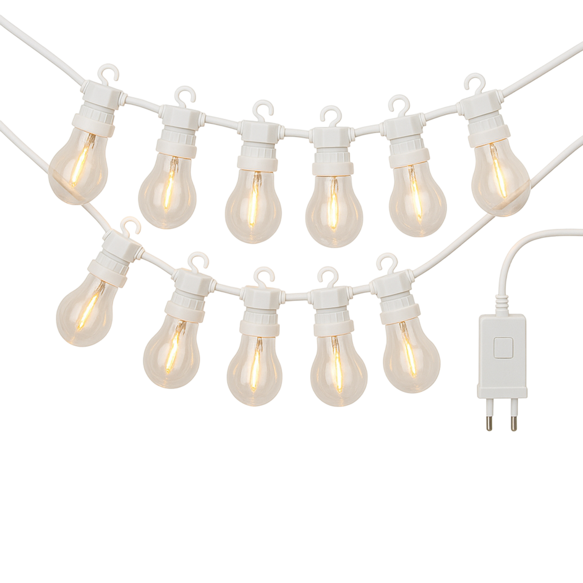 Guirnalda de luces con 10 bombillas en color blanco cálido, cada una con un filamento, montadas en una bola A60 de tamaño 450x6x15cm. La distancia entre las bombillas es de 50cm y el cable conductor tiene una longitud de 5m. Viene con transformador IP44 de 24V-3.6W, cable blanco y temporizador incluido. No es conectable a otras guirnaldas.