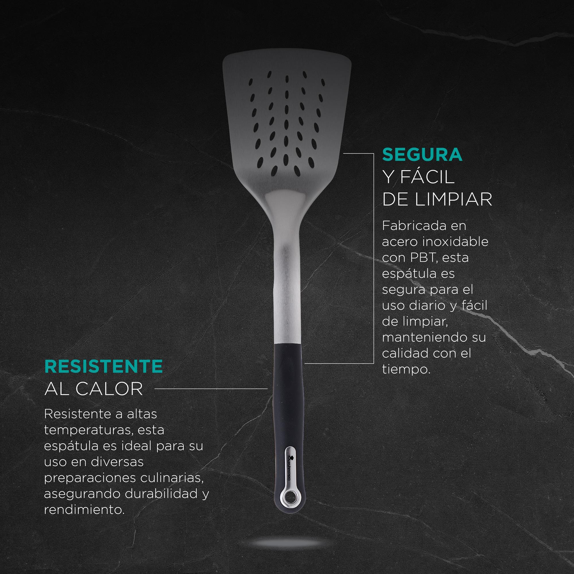 Espátula ranurada fabricada en acero inoxidable._x000D_