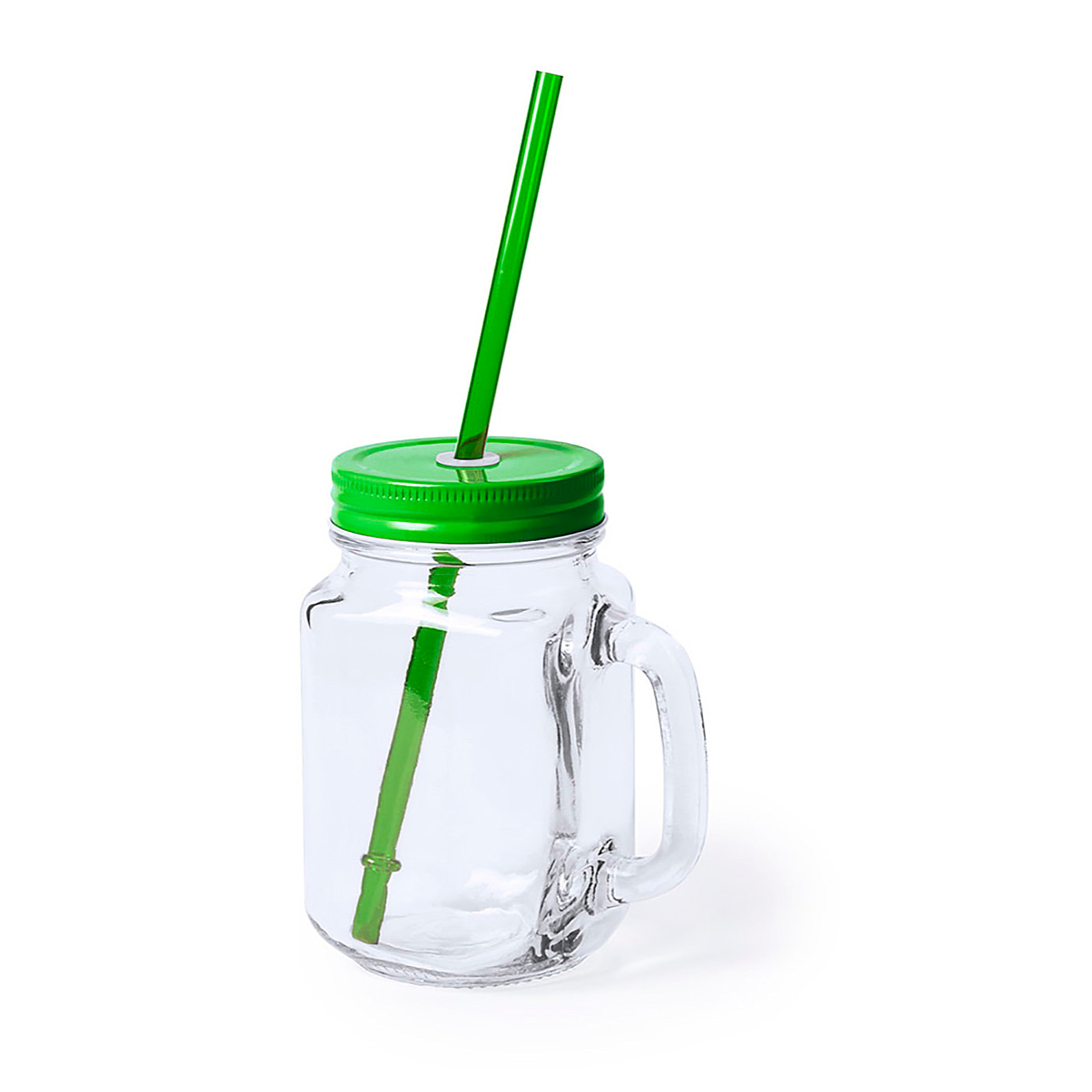 Tarro multiusos de cristal de 500ml de capacidad con tapa y pajita en color vivo. Con tapa metálica a rosca. Cristal