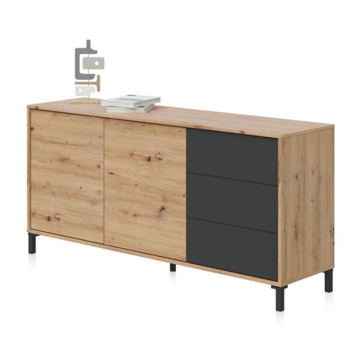 El aparador Brooklyn es un amplio aparador de estilo nórdico con un toque industrial y gran capacidad de almacenaje. Cuenta con 2 módulos de almacenaje: un módulo doble tipo armario, cerrado con 2 puertas con bisagras metálicas y sistema push de apertura, y un módulo lateral con 3 cajones.