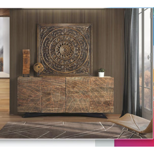 Aparador 4 puertas fabricado en madera de acacia y base de metal, con detalles de las puertas talladas a mano.