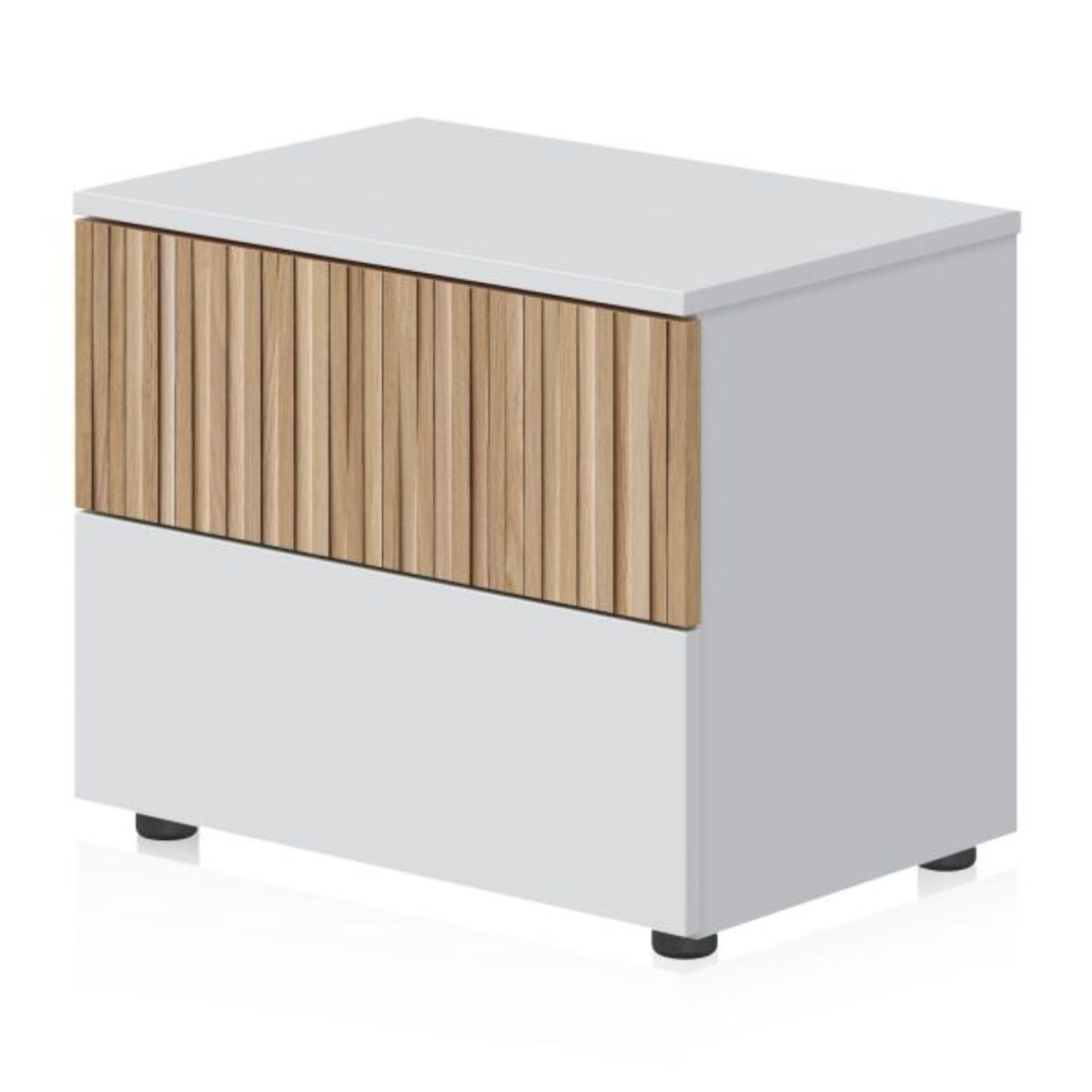 La mesita de noche Nitza es un mueble de dormitorio fabricado con melamina y DM de alta calidad con un acabado en color blanco artik y natur, esta combinación hace que sea fácilmente adaptable a diferentes estilos decorativos a la misma vez que garantiza durabilidad y robustez.