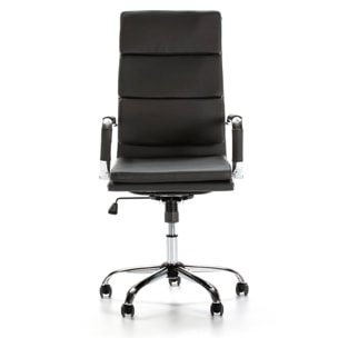 Sillón tapizado con piel sintética con tacto agradable y fácil de limpiar; relleno de espuma de alta densidad muy cómoda. Estable y rígida - Dispone de mecanismo de elevación con bombín de gas y si extrae la palanca hacia afuera podrá disfrutar de un grado elevado de inclinación. Pata de estrella (5 pies) metálica cromada para evitar el desgaste de la pintura con un diámetro de 58 cm y que soportan un peso homologado de hasta 150 kg. Producto en kit de fácil montaje, se entrega con las instrucciones de montaje y sus correspondientes herramientas para su óptimo montaje. MEDIDAS: Largo 55 cm, Profundo 71 cm y Alto 110/118 cm. Altura del asiento de 48/58