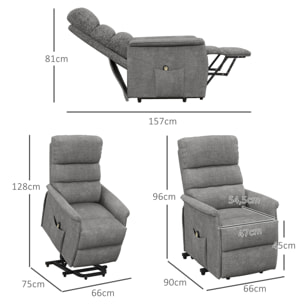 Description:Este sillón reclinable eléctrico te ofrece una experiencia única de relajación y confort. Con solo pulsar un botón del mando a distancia, puedes reclinar el respaldo y elevar el reposapiés, ajustando la posición a tu gusto sin ningún esfuerzo. También dispone de un sistema de elevación que levanta el asiento hasta 45°, permitiéndote pasar fácilmente de la posición de sentado a la de pie.