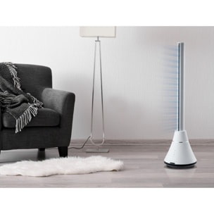 Se caracteriza porque no tiene aspas, por lo que su funcionamiento es totalmente silencioso. Tiene un display digital con 8 velocidades, temporizador (7.5h) y oscilación automática. Este moderno ventilador puede conectarse a la red WiFi y controlarse desde cualquier dispositivo móvil gracias a la App TuYa Smart, también incluye mando a distancia.