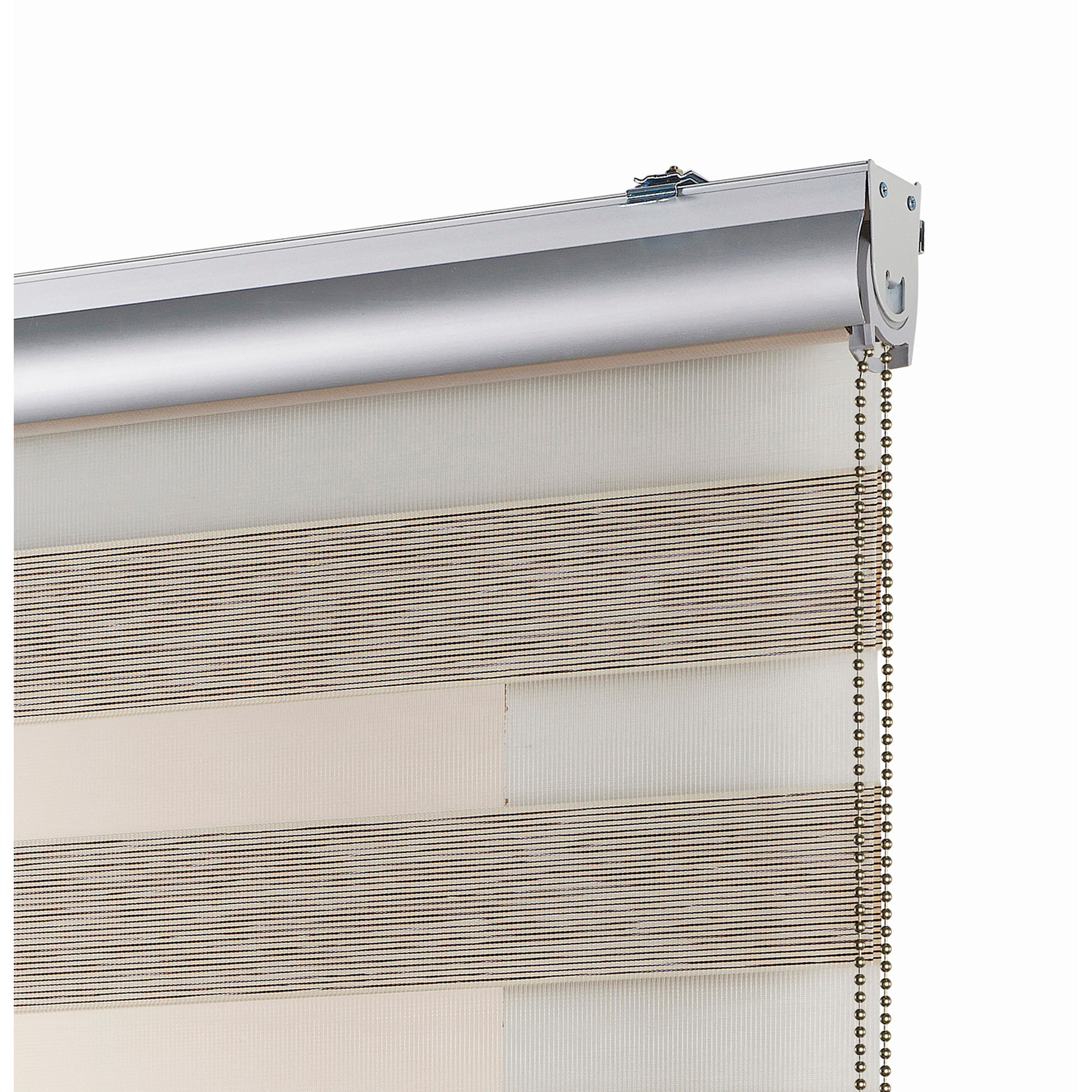 Estor enrollable doble en tejido de franjas transparentes cuyo movimiento vertical proporciona un decorativo y práctico juego de luz, así como el control de la visión exterior y la privacidad. Mecanismo con cajetín superior y contrapeso de aluminio.