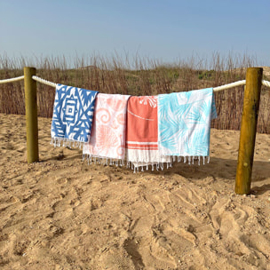 Pareo/toalla estampado en algodón por un lado y acabado en rizo por el otro, acabado con fecos decorativos. Toalla de playa o de baño perfecta cómo pareo, foulard, toalla, etc...Se puede adaptar a diversos usos aportando un aire chic y desenfadado.