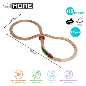 Este juego de tren de madera de 20 piezas incluye 16 piezas de pista de madera, 1 puente y 3 trenes de madera en colores amarillo, verde y rojo.